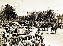 After the June 1940 armistice, twenty-three S 35s were allowed to be sent to West Africa to bolster the hold of the Vichy regime on that region.[19] They were issued to the 12e régiment de Chasseurs d'Afrique that, after French forces in Africa had sided with the Allies, operated them against German and Italian forces during the Tunisia Campaign.[20] After taking part in the Tunis victory parade, 12e RCA's S35s were replaced by M4 Shermans, but crews often affixed the SOMUA plate on their new tanks.[21]
