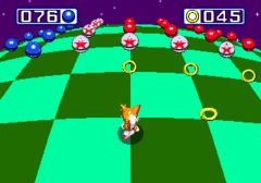 The second type, triggered by entering giant rings found in secret passages, involves running around a 3D map and passing through all of a number of blue spheres arranged in patterns. Passing through a blue sphere turns it red, and touching a red sphere causes the player to leave the stage, unless the player has just completed a cycle around an arrangement of blue spheres, in which case all of these spheres turn to harmless rings. Removing all of the blue spheres gives the player a Chaos Emerald; if Sonic (not Tails) collects all seven, he can become Super Sonic at will, which makes him invincible to most obstacles.[8][11] Failing to collect the seven Chaos Emeralds triggers a post-credits scene in which Robotnik and Knuckles taunt the player.[12]