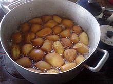 In Chile, sopaipillas (or sopaipas) are known to have been eaten at least since 1726.[9] Although Traditional Chilean sopaipillas (made in the central part of Chile) include cooked ground pumpkin in their dough, this is typically not the case in the South of Chile.[2] Depending if they are served as a pastry or bread Chilean sopaipillas are traditionally served with either pebre (a sauce of chili pepper, onion, garlic and coriander) or boiled in chancaca sauce (a homemade hot syrup cooked with panela, orange peel and cinnamon, and then they are called sopaipillas pasadas). They are also served with mustard, ketchup, hot butter, avocado or cheese.[2][3][9] In Chile sopaipillas are traditionally homemade and eaten during days of heavy rain,[2] as well as enjoying widespread popularity as street food. Chilean sopaipillas are round and flat, sporting holes pricked through the centre of the dough, usually by a fork.