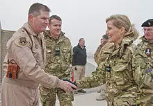 In 2013, the couple visited South Africa. Later that year, the Countess made solo trips to India and Qatar as the patron of the sight-saving charity Orbis UK.[20] [32][33] She made a similar visit to Bangladesh in November 2017.[34] The Countess, as Colonel-in-Chief of Corps of Army Music, visited The Countess of Wessex's String Orchestra at the Royal Artillery Barracks, in London. On 3 March 2014, the Queen approved the title of "The Countess of Wessex's String Orchestra" for the new Army String Orchestra in recognition of the Corps of Army Music's Colonel-in-Chief.[35] In November 2014, the Countess was in Zambia representing the Queen at the State funeral of the late President of Zambia, Michael Sata.[36]