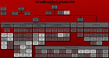 The Soprano family (originally the DiMeo family) is a fictional Neapolitan-American organized crime family based in New Jersey, from the HBO series The Sopranos. It will also appear in the prequel film The Many Saints of Newark. The family consists of an administration and six crews. They are allies of the Lupertazzi family in New York City but the two become rivals as the series progresses. The family is loosely based on the DeCavalcante crime family, a real New Jersey Mafia family.[1][2][3]