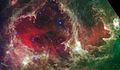 W5, a radio source within the nebula, spans an area of sky equivalent to four full moons and is about 6,500 light-years away in the constellation Cassiopeia. Like other massive star-forming regions, such as Orion and Carina, W5 contains large cavities that were carved out by radiation and winds from the region's most massive stars. According to the theory of triggered star formation, the carving out of these cavities pushes gas together, causing it to ignite into successive generations of new stars. The image in the gallery above contains some of the best evidence yet for the triggered star formation theory. Scientists analyzing the photo have been able to show that the ages of the stars become progressively and systematically younger with distance from the center of the cavities.[1]