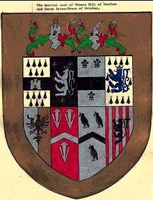 In 1668 a semi-circular pediment bearing the marital coat of arms of Thomas Hill, a descendant of Sir Rowland's and a friend of Samuel Pepys, was added above the front door. The blazon on those arms is given below.