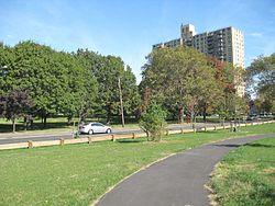 Soundview Park occupies 205 acres (83 ha) in the southwestern section of the neighborhood, with ballfields and playgrounds and a pedestrian/bike greenway along the left bank of the Bronx River estuary from Lafayette Avenue to Leland Avenue.[13] It was built on filled land[14] starting in 1939.[15] The first 93 acres (38 ha) of the park were acquired by the City of New York in 1937,[16] and 66 acres (27 ha) more were acquired along the water's edge in December 1939.[17]