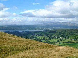 The top of the fell is a series of grassy knolls with the highest of these marked by a small pile of stones, the view is extremely fine for such a small fell, there is a fine vista of the high mountains to the west, to the south Windermere is well seen and beyond that Morecambe Bay.
