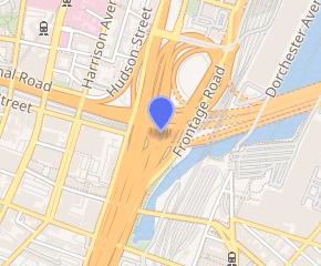 The interchange dominates the South Bay parcel, a 10-acre (40,000 m²) site between Chinatown and the Leather District. It is roughly bounded by Kneeland Street, Hudson Street, the Massachusetts Turnpike mainline, and the Interstate 93 mainline. Currently owned by the Massachusetts Turnpike Authority (MTA), the area is taken up by a major highway interchange between 90, 93, and local streets. There were original plans to re-develop the area with a 600-foot tall office tower, but no such project has taken place.