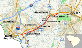 South Carolina Highway 421 (SC 421) is a 10.360-mile (16.673 km) state highway in the U.S. state of South Carolina. It is an alternate route to U.S. Route 1 (US 1) and US 78 between North Augusta and Aiken.