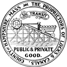 The canal dates to February 1792, when leading citizens of western Massachusetts proposed to build a canal around the Great Falls at South Hadley, a 53-foot (16 m) drop in the Connecticut River that blocked boat transport. At that time, all cargo needed to be unloaded for 2.5 miles (4.0 km) of land transport around the falls, driving river transport cost for a bushel of wheat from Northampton, Massachusetts to Windsor, Connecticut to more than double its transport costs by sea from Hartford to Boston.[3] John Hancock, then Governor of Massachusetts, signed the charter which incorporated the Proprietors of the Locks and Canals on the Connecticut River. Their corporate seal bore the motto "SIC TRANSIT - Public & Private Good".