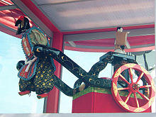 The south-pointing chariot, a mechanical-geared, wheeled vehicle used to discern the southern cardinal direction (without magnetics), was given a brief description by Ma's contemporary Fu Xuan.[3] The contemporary 3rd century AD source of the Weilüe, written by the East Han Dynasty politician Yuan Huan also described the south-pointing chariot of belonging to the Chinese mechanical engineer and politician Ma Jun.[4] The Jin Dynasty (265–420 CE) era text of the Shu Zheng Ji (Records of Military Expeditions), written by Guo Yuansheng, recorded that south-pointing chariots were often stored in the northern gatehouse of the Government Workshops (Shang Fang) of the capital city.[4] However, the later written Song Shu (Book of Song) (6th century CE) recorded the south-pointing chariot's design and use in further detail, as well as creating the background legend of the device's (supposed) use long before Ma's time, in the Western Zhou Dynasty (1050–771 BCE). The book also provided a description of the south-pointing chariot's re-invention and use in times after Ma Jun and the Three Kingdoms. The 6th century AD text, translated by the British scientist and historian Joseph Needham, reads as follows (the south-pointing chariot is referred to as the south-pointing carriage):