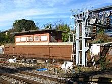 Southampton Central station was opened as Southampton West in 1895, to replace the smaller nearby West End station (originally named Blechynden when it opened in 1847).[2] The station was on the seafront, specifically the stretch of water known as West Bay, with the water reaching right up to the southern edge of the platforms at high tide. A series of land reclamation projects to expand the docks, largely funded by the London and South Western Railway, culminated in the building of the vast "New Docks" (now Western Docks) between 1927 and 1934, which led to all of West Bay being reclaimed and the station becoming landlocked. The new land and the demand for new lines allowed the station to be enlarged and redeveloped in 1934–1935 (from two platforms to four), and it became Southampton Central.[3] The new station buildings were largely constructed from concrete.[4]