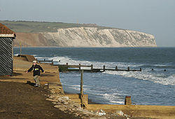 Downland develops when chalk rock becomes exposed at the surface. The chalk slowly erodes to form characteristic rolling hills and valleys. As the Cretaceous chalk layer in southern England is typically tilted, chalk downland hills often have a marked scarp slope on one side, which is very steep, and a much gentler dip slope on the other. Where the downs meet the sea, characteristic white chalk cliffs form, such as the White Cliffs of Dover and Beachy Head.[1]