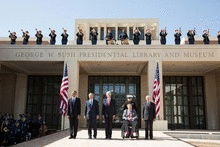 On February 22, 2008, the university trustees unanimously instructed President R. Gerald Turner to enter into an agreement to establish the George W. Bush Presidential Center on 23 acres on the southeast side of the campus.[27] The center, which includes a presidential library, museum, institute, and the offices of the George W. Bush Foundation, was dedicated on April 25, 2013, in a ceremony which featured all living former U.S. Presidents Jimmy Carter, George H. W. Bush, Bill Clinton, George W. Bush, and then-incumbent U.S. president, Barack Obama.[28]