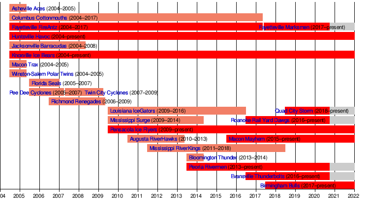 - Mississippi RiverKings (2011–18) Joined from the Central Hockey League in 2011, ownership suspended operations in 2018 while the league searches for new owners.