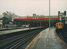 In 1923, the Southern Railway took over 24 1&fras1;2 route miles (39.4 km) of railway electrified with overhead line at 6.7 kV, 57 route miles (92 km) of railway electrified with a third rail at 660 V DC, and the 1 1&fras1;2-mile (2.4 km) long underground Waterloo & City Railway.[13] The route mileage of third rail electrification was to more than double in 1925 when the current was switched on on the routes to Guildford, Dorking and Effingham and the route from Victoria and Holborn Viaduct to Orpington via Herne Hill and the Catford Loop.[14] In 1926, electric trains started to run on the South Eastern Main Line route to Orpington and the three lines to Dartford using the 3rd rail system.[15] On 9 August 1926, the Southern announced that the DC system was to replace the AC system[16] and the last AC train ran on 29 September 1929.[17] Including the London Bridge to East Croydon route, electrified in 1928, by the end of 1929, the Southern operated over 277 1&fras1;2 route miles (446.6 km) of third rail electrified track and in that year ran 17.8 million electric train miles.[18]