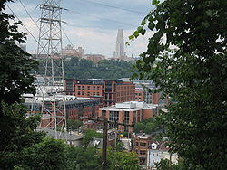 SouthSide Works is an open-air retail, office, entertainment, and residential complex (often referred to as a lifestyle center) located on the South Side of the city of Pittsburgh, Pennsylvania, U.S. and just across the Monongahela River from the Pittsburgh Technology Center, the University of Pittsburgh and Carnegie Mellon University. The $300 million complex ($417 million today) opened in stages between 2002 and 2004 and offers more than 34 acres (140,000 m2) of shops, offices, hotels and apartments, and has a new urbanist design. The site has over 330,000 square feet (30,000 m2) of specialty retail, restaurant, hotel, and apartment space. In addition, the site has 700,000 square feet (70,000 m2) of office space.[1]