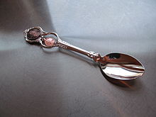 A souvenir spoon is a decorative spoon used as a memento of a place or to display as a 'trophy' of having been there. The spoons may be made from a number of different materials such as sterling silver, nickel, steel, and in some cases wood. They are often hung on a spoon rack and are typically ornamental, depicting sights, coat of arms, associated characters, etc. The year the spoon was made may be inscribed in the bowl, or on the back. The entire spoon, including the bowl, handle, and finial may be used to convey the theme. The first souvenir spoons in the United States were made in 1890 by Galt & Bros., Inc. of Washington D.C., featuring the profile of George Washington.[1] Although the George Washington spoon was one of the most popular designs, relatively few made by Galt & Bro. remain in circulation.[2] One year later, a souvenir Salem Witch spoon was made, and sold seven thousand copies. It was created by Daniel Low, a jeweler in Salem, Massachusetts, after he saw souvenir spoons on vacation in Germany. The Witch Spoon is given credit for starting the souvenir spoon hobby in the U.S.[1]