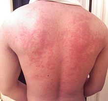 Symptoms may include: rash, hives, itching of the mouth, lips, tongue, throat, eyes, skin, or other areas, swelling of lips, tongue, eyelids, or the whole face, difficulty swallowing, runny or congested nose, hoarse voice, wheezing, shortness of breath, diarrhea, abdominal pain, lightheadedness, fainting, nausea and vomiting. Symptoms of allergies vary from person to person and may vary from incident to incident.[1][4] Serious danger regarding allergies can begin when the respiratory tract or blood circulation is affected. The former can be indicated by wheezing, a blocked airway and cyanosis, the latter by weak pulse, pale skin, and fainting. When such severe symptoms occur, the allergic reaction is called anaphylaxis.[1][4] Anaphylaxis occurs when IgE antibodies are released into the systemic circulation in response to the allergen, affecting multiple organs with severe symptoms.[1][4][5] Untreated, the anaphylactic response can proceed to a rapid heart beat, systemic vasodilation and a rapid decrease in blood pressure as conditions of anaphylactic shock,[6] requiring emergency intervention to prevent a fatality (rare for soy allergy).[5][7]