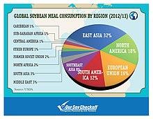 Globally, about 98 percent of soybean meal is used as animal feed.[8] Of the US soybean production magnitude from 2010 through 2012, about 44 percent was exported as soybeans, and 53 percent was crushed in the US. Of the crushed tonnage, 19 percent was recovered as soybean oil and the remainder was recovered as soybean meal. Of the total US soybean tonnage produced, about 35 percent was fed to US livestock and poultry as soybean meal. Most of the remaining soybean meal produced in the US was exported.[9] It has been estimated that, of soy meal fed to animals in the US, 48 percent is fed to poultry, 26 percent to swine, 12 percent to beef cattle, 9 percent to dairy cattle, 3 percent is used in fish feed and about 2 percent in pet food.[10] Although this implies that the tonnage of soybean meal fed to other species is relatively minor, such use is not unimportant. For example, for rapidly growing lambs on low-protein feeds, soybean meal can be an important supplement to ensure adequate protein intake,[11] and partly because of its palatability, soybean meal is often recommended for use in starter rations when creep feeding lambs.[12][13]