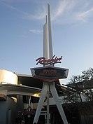 A new Matterhorn Bobsleds attraction was considered, but it wouldn't fit within Florida's Fantasyland.[6] Ultimately, designers returned to designing Space Mountain. The Magic Kingdom's Tomorrowland had the right amount of available land, and computing technology had improved significantly since the initial design phases.[7] However, it was decided the mountain would be built outside the park, on the opposite side of the train tracks that act as the perimeter of the park. To help cover the cost of developing and building Space Mountain, Card Walker, the CEO of Walt Disney Productions, convinced RCA chairman Robert Sarnoff to sponsor the new attraction; RCA was contracted by Disney to provide the communications hardware for the Walt Disney World Resort, and their contract stated that if Disney presented an attraction of interest, RCA would provide US$10 million to support it.[8] Space Mountain then opened on January 15, 1975.