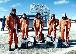 | Francis R. Scobee, Commander Michael J. Smith, Pilot Ronald McNair, Mission Specialist Ellison Onizuka, Mission Specialist Judith Resnik, Mission Specialist Greg Jarvis, Payload Specialist Christa McAuliffe, Payload Specialist | |