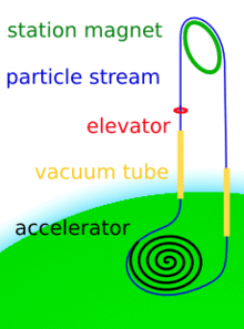 The lower part of a pellet stream has to be in a vacuum tube to avoid excessive drag in the atmosphere. Similar to the top station, this tube can be supported by its own system of transferring momentum from a space-bound stream to a surface-bound stream. If the tube itself also accelerates the station-supporting stream, it would have to transfer additional momentum to an earth-bound stream in order to keep itself supported. The tube-supporting streams could also be designed to integrate with the station-supporting streams.[3]