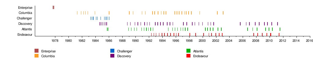 | Columbia | OV-102 | 28 | 300d 17h 47m 15s | 4,808 | 17d 15h 53m 18s | STS-1 | 12 April 1981 | STS-107 | 16 January 2003 | 0 / 0 | [42][43][46][47][48] |