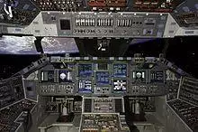 The orbiter's flight deck or cockpit originally had 2,214 controls and displays, about three times as many as the Apollo command module.[2] The crew cabin consisted of the flight deck, the mid-deck, and the utility area. The uppermost of these was the flight deck, in which sat the Space Shuttle's commander and pilot, with up to two mission specialists seated behind them. The mid-deck, which was below the flight deck, had three more seats for the rest of the crew members.