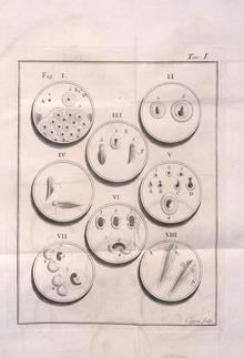 Spallanzani's first scientific work was in 1765 Saggio di osservazioni microscopiche concernenti il sistema della generazione de' signori di Needham, e Buffon (Essay on microscopic observations regarding the generation system of Messrs. Needham and Buffon) which was the first systematic rebuttal of the theory of the spontaneous generation.[2] At the time, the microscope was already available to researchers, and using it, the proponents of the theory, Pierre Louis Moreau de Maupertuis, Buffon and John Needham, came to the conclusion that there is a life-generating force inherent to certain kinds of inorganic matter that causes living microbes to create themselves if given sufficient time.[6] Spallanzani's experiment showed that it is not an inherent feature of matter, and that it can be destroyed by an hour of boiling. As the microbes did not re-appear as long as the material was hermetically sealed, he proposed that microbes move through the air and that they could be killed through boiling. Needham argued that experiments destroyed the "vegetative force" that was required for spontaneous generation to occur. Spallanzani paved the way for research by Louis Pasteur, who defeated the theory of spontaneous generation almost a century later.[7]
