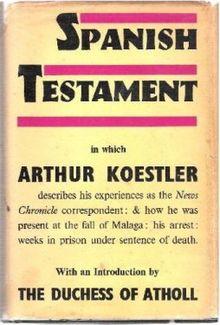 Spanish Testament is a 1937 book by Arthur Koestler, describing his experiences during the Spanish Civil War. Part II of the book was subsequently published on its own, with minor modifications, under the title Dialogue with Death (see below). Koestler made three trips to Spain during the civil war; the third time he was captured, sentenced to death and imprisoned by the Nationalist forces of General Franco. Koestler was at that time working on behalf of the Comintern and as an agent of the Loyalist Government's official news agency, using for cover accreditation to the British daily News Chronicle.