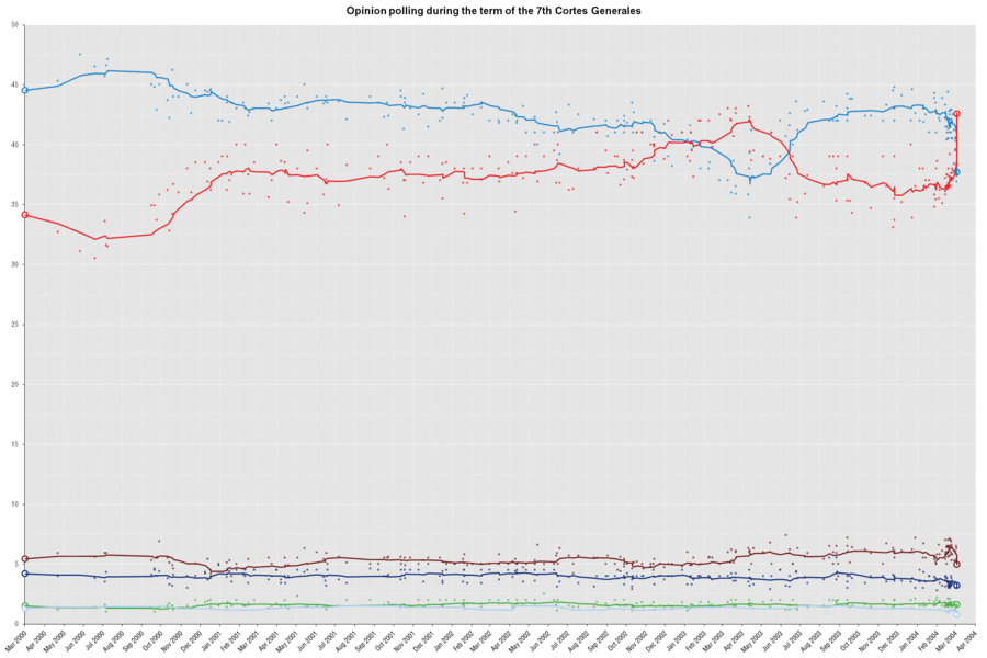 On 9 January 2004, it was announced that the general election would be held on 14 March, with the Cortes to be dissolved on 20 January.[14][15] The election date was agreed with Andalusian president Manuel Chaves, to make it being held concurrently with the 2004 Andalusian regional election.[16]
