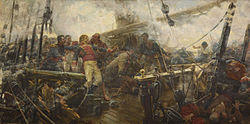 San Juan Nepomuceno was one of the last ships still fighting after most of the French ships had surrendered and most of the Spanish ships had either been captured or had yielded. The commander, Don Cosme Churruca, had previously ordered for the flag to be nailed to the highest mast. At the time, it was commonplace for ships to signal surrender by lowering their nation's flag. 'Nailing the flag' was a way to tell the enemy, allies, and indeed the ship's own crew and officers not to expect an easy surrender. As the hours passed Churruca, whose leg had been torn off by a cannonball, the deck of his ship covered by the blood of his wounded and dead seamen, continued to stubbornly order his ship's batteries to fire. Mortally wounded, the Basque-born Churruca prohibited his officers from surrendering and ordered them to continue returning fire whilst he remained breathing. His officers kept their word, even after Churruca died and command of the ship had been passed to the second-in-command, Francisco de Moyna, who continued the fight until he himself was killed. He was replaced by the next officer in command who also refused to surrender. However, unable to break the circle of fire formed by the six enemy ships, including Defiance, Tonnant and Dreadnought, and in order to prevent the ship from sinking with all the wounded trapped below, the last officer left alive in San Juan Nepomuceno yielded with over 400 dead and injured on board.