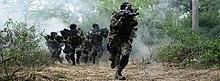 First conceived in 1985, the Marine Commando Force, also called MARCOS, was raised in February 1987. It is the special forces unit of the Indian Navy.[13][14] Initially, the U.S. Navy SEALs and British special forces trained a few officers of the Indian navy who formed the first core of MARCOS.[15][16] Months after their creation, MARCOS were deployed in Sri Lanka against the Liberation Tigers of Tamil Eelam (LTTE) in July 1987. In the 1990s, MARCOS undertook numerous operations such as Operation Tasha (1991) against the LTTE, Operation Zabardust (1992) against a ship that was smuggling arms and in support of the United Nations in Somalia (1993). They also participated in the 1999 Kargil War.[14] Since 1995, MARCOS are permanently deployed for counter-terrorism operations in Jammu and Kashmir against militants.[14][17] MARCOS had participated in efforts against the 2008 Mumbai attacks alongside the National Security Guards but their effectiveness was diluted due to bureaucratic indecision.[18] MARCOS have also been deployed in anti-piracy operations.[19]