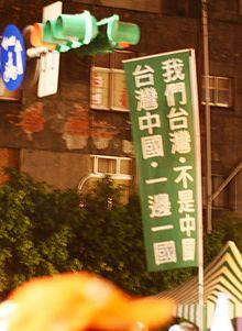 Banner during a 2012 rally in Taipei. Translation: "Our Taiwan is not China. Taiwan and China, one country on each side."
