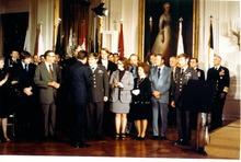 In 1958 the DoD added two additional pay grades to give enlisted soldiers more opportunities to progress to a full career with additional opportunities for promotion. Thus the recognition was changed to six specialist ranks, and the pay grade was tied into the rank designation: specialist four (E-4), specialist five (E-5), specialist six (E-6), specialist seven (E-7), specialist eight (E-8), and specialist nine (E-9).[4] The "Super Grades" of Spec./8 and Spec./9 were respectively given one and two Goldenlite chevrons below the Eagle.