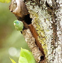 Spectacled parrotlets nest in tree cavities or similar structures. Often they will make use of abandoned tree hole or clay mountain nests created by other unrelated bird species, though they are also capable of creating new nests. The female incubates eggs[7] while the male assumes the role of guarding the nest and feeding the female and chicks once they are hatched. Spectacled parrots are monogamous and some pairs may even mate for life.