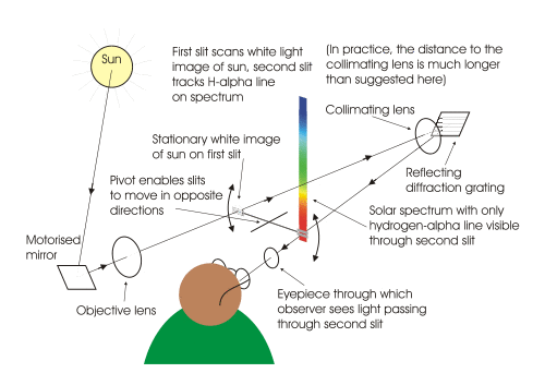 The basic spectrohelioscope is a complex machine that uses a spectroscope to scan the surface of the Sun. The image from the objective lens is focused on a narrow slit revealing only a thin portion of the Sun's surface. The light is then passed through a prism or diffraction grating to spread the light into a spectrum. The spectrum is then focused on another slit that allows only a narrow part of the spectrum (the desired wavelength of light for viewing) to pass. The light is finally focused on an eyepiece so the surface of the Sun can be seen. The view, however, would be only a narrow strip of the Sun's surface. The slits are moved in unison to scan across the whole surface of the Sun giving a full image. Independently nodding mirrors can be used instead of moving slits to produce the same scan: the first mirror selects a slice of the Sun, the second selects the desired wavelength.
