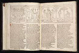In the 15th century, with the advent of printing, the work then appeared in four blockbook editions, two Latin and two in Dutch, and then in sixteen incunabulum editions by 1500. The blockbooks present unique questions as only editions of this work combine hand-rubbed woodcut pages with text pages printed in movable type. Further eccentricities include a run of twenty pages in one edition which are text cut as a woodcut, based on tracings of pages from another edition printed with movable type. Though the circumstances of production of these editions are unknown, two of the editions are in Dutch and the Netherlands was probably the centre of production, as with most blockbooks.[8] Hind places them in Holland, from about 1470–75.[9] It appears the Prohemium may have been sold separately as a pamphlet, as one version speaks of the usefulness of it for "poor preachers who cannot afford the entire book".[10]