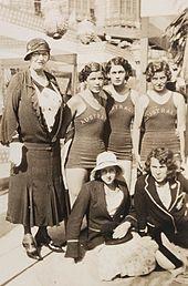 The controversial yet revolutionary racerback style's open shoulder and exposed back allowed greater range of motion in water and was quickly adopted by competitive swimmers, despite being banned by some beaches.[7] In 1932, Speedo made its Olympic debut when 16-year old Australian Clare Dennis won the Women's 200 Meter Breaststroke at the Los Angeles Olympic Games. After nearly being disqualified for "showing too much shoulder" in her regulation silk Speedo brand swimsuit, Dennis went on to set a world record time of 3:06.3.[8] The 1936 Berlin Summer Games also saw some controversy as the men's Australian swim team featured shirtless swim trunks for the first time. Also in 1936, Alexander MacRae became involved in the Surf Life Saving Association. To this day, Speedo continues to support the Australian volunteer organisation.[9]