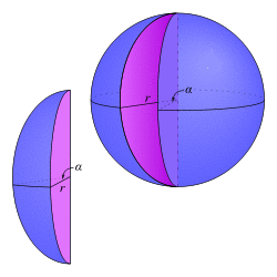 Extrapolating the same principle and considering that the surface area of a sphere is given by 4πr2, it can be seen that the surface area of the lune corresponding to the same wedge is given by[A]