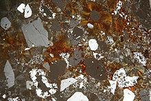 Variolites are a type of radiate fibrous growth, resembling spherulites in many respects, consisting of minute feathery crystals spreading outwards through a fine grained or glassy rock. In variolites there are straight or feathery feldspar crystals (usually oligoclase) forming pale-colored spherulites a quarter to half an inch in diameter. The same rocks often contain similar aggregates of plumose skeleton crystals of augite. Many volcanic rocks have small lath-shaped crystals of feldspar or augite diverging from a common center.
