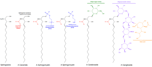 Sphingolipids are a class of lipids containing a backbone of sphingoid bases, a set of aliphatic amino alcohols that includes sphingosine. They were discovered in brain extracts in the 1870s and were named after the mythological sphinx because of their enigmatic nature.[1] These compounds play important roles in signal transduction and cell recognition. Sphingolipidoses, or disorders of sphingolipid metabolism, have particular impact on neural tissue. A sphingolipid with an R group consisting of a hydrogen atom only is a ceramide. Other common R groups include phosphocholine, yielding a sphingomyelin, and various sugar monomers or dimers, yielding cerebrosides and globosides, respectively. Cerebrosides and globosides are collectively known as glycosphingolipids.
