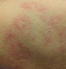 A spider angioma or spider naevus (plural spider naevi) is a type of telangiectasis[2] (swollen blood vessels) found slightly beneath the skin surface, often containing a central red spot and reddish extensions which radiate outwards like a spider's web. They are common and may be benign, presenting in around 10–15% of healthy adults and young children.[3] However, having more than three spider angiomas is likely to be abnormal and may be a sign of liver disease. It also suggests the probability of esophageal varices.[4]