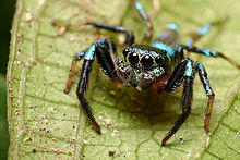 - ^ Li, D., Yik, S.H. & Seah, W.K. (2002). "Rivet-like nest-building and agonistic behaviour of Thiania bhamoensis, an iridescent jumping spider (Araneae: Salticidae) from Singapore" (PDF). Archived from the original (PDF) on 2007-08-11. Retrieved 2007-08-22.