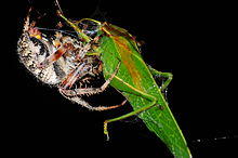 Several different types of silk may be used in web construction, including a "sticky" capture silk and "fluffy" capture silk, depending on the type of spider. Webs may be in a vertical plane (most orb webs), a horizontal plane (sheet webs), or at any angle in between. It is hypothesized that these types of aerial webs co-evolved with the evolution of winged insects. As insects are spiders' main prey, it is likely that they would impose strong selectional forces on the foraging behavior of spiders.[3][12] Most commonly found in the sheet-web spider families, some webs will have loose, irregular tangles of silk above them. These tangled obstacle courses serve to disorient and knock down flying insects, making them more vulnerable to being trapped on the web below. They may also help to protect the spider from predators such as birds and wasps.[13]