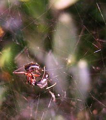 Spider webs have existed for at least 100 million years, as witnessed in a rare find of Early Cretaceous amber from Sussex, southern England.[2] Insects can get trapped in spider webs, providing nutrition to the spider; however, not all spiders build webs to catch prey, and some do not build webs at all. "Spider web" is typically used to refer to a web that is apparently still in use (i.e. clean), whereas "cobweb" refers to abandoned (i.e. dusty) webs.[3] However, "cobweb" is used to describe the tangled three-dimensional web[4] of some spiders of the theridiidae family. While this large family is also known as the tangle-web spiders, cobweb spiders and comb-footed spiders, they actually have a huge range of web architectures.