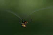 The stickiness of spiders' webs is courtesy of droplets of glue suspended on the silk threads. This glue is multifunctional – that is, its behavior depends on how quickly something touching it attempts to withdraw. At high velocities, they function as an elastic solid, resembling rubber; at lower velocities, they simply act as a sticky glue. This allows them to retain a grip on attached food particles.[19] The web is also electrically conductive which causes the silk threads to spring out to trap their quarry, as flying insects tend to gain a static charge which attracts the silk.[20]