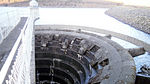 In some cases, bell-mouth spillways are gate-controlled. The spillway at Hungry Horse Dam (pictured), in Montana, U.S., the highest morning glory structure in the world,[13] is controlled by a 64-by-12-foot (19.5 by 3.7 m) ring gate. One of the most well-known of these spillways is the one in Covão dos Conchos reservoir lake, in Portugal, which is constructed to look like a natural formation; a video of this went viral on the Internet in early 2016. The largest bell-mouth spillway is in Geehi Dam, in New South Wales, Australia, measuring 105 ft (32 m) in diameter at the lake's surface.[14][15][16]