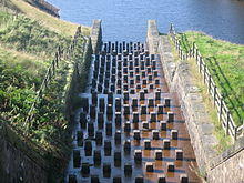 Stepped channels and spillways have been used for over 3,000 years.[2] Despite being superseded by more modern engineering techniques such as hydraulic jumps in the mid twentieth century, since around 1985[3] interest in stepped spillways and chutes has been renewed, partly due to the use of new construction materials (e.g. Roller-compacted concrete, gabions) and design techniques (e.g. embankment overtopping protection).[4][5] The steps produce considerable energy dissipation along the chute[6] and reduce the size of the required downstream energy dissipation basin.[7][8]