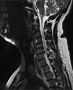MRI of fractured and dislocated neck vertebra that is compressing the spinal cord | |