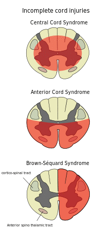 Central cord syndrome, almost always resulting from damage to the cervical spinal cord, is characterized by weakness in the arms with relative sparing of the legs, and spared sensation in regions served by the sacral segments.[24] There is loss of sensation of pain, temperature, light touch, and pressure below the level of injury.[25] The spinal tracts that serve the arms are more affected due to their central location in the spinal cord, while the corticospinal fibers destined for the legs are spared due to their more external location.[25] The most common of the incomplete SCI syndromes, central cord syndrome usually results from neck hyperextension in older people with spinal stenosis. In younger people, it most commonly results from neck flexion.[26] The most common causes are falls and vehicle accidents; however other possible causes include spinal stenosis and impingement on the spinal cord by a tumor or vertebral disk.[27]